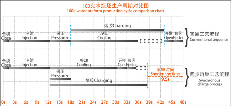 采用PET專用螺桿,顯著提高熔膠速度和注射量,降低塑化溫度與AA值,有效改善瓶坯的收縮,提高透明度;