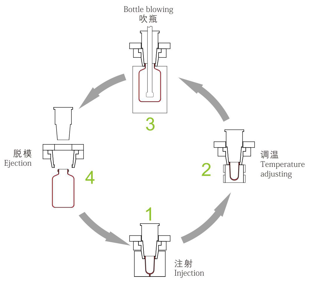 ·轉(zhuǎn)盤上均布注射、調(diào)溫、拉吹、脫模四個(gè)工位,同時(shí)進(jìn)行注射成型、瓶胚調(diào)溫、拉吹成型、制品脫模四個(gè)工藝,實(shí)現(xiàn)一步法注拉吹成型。